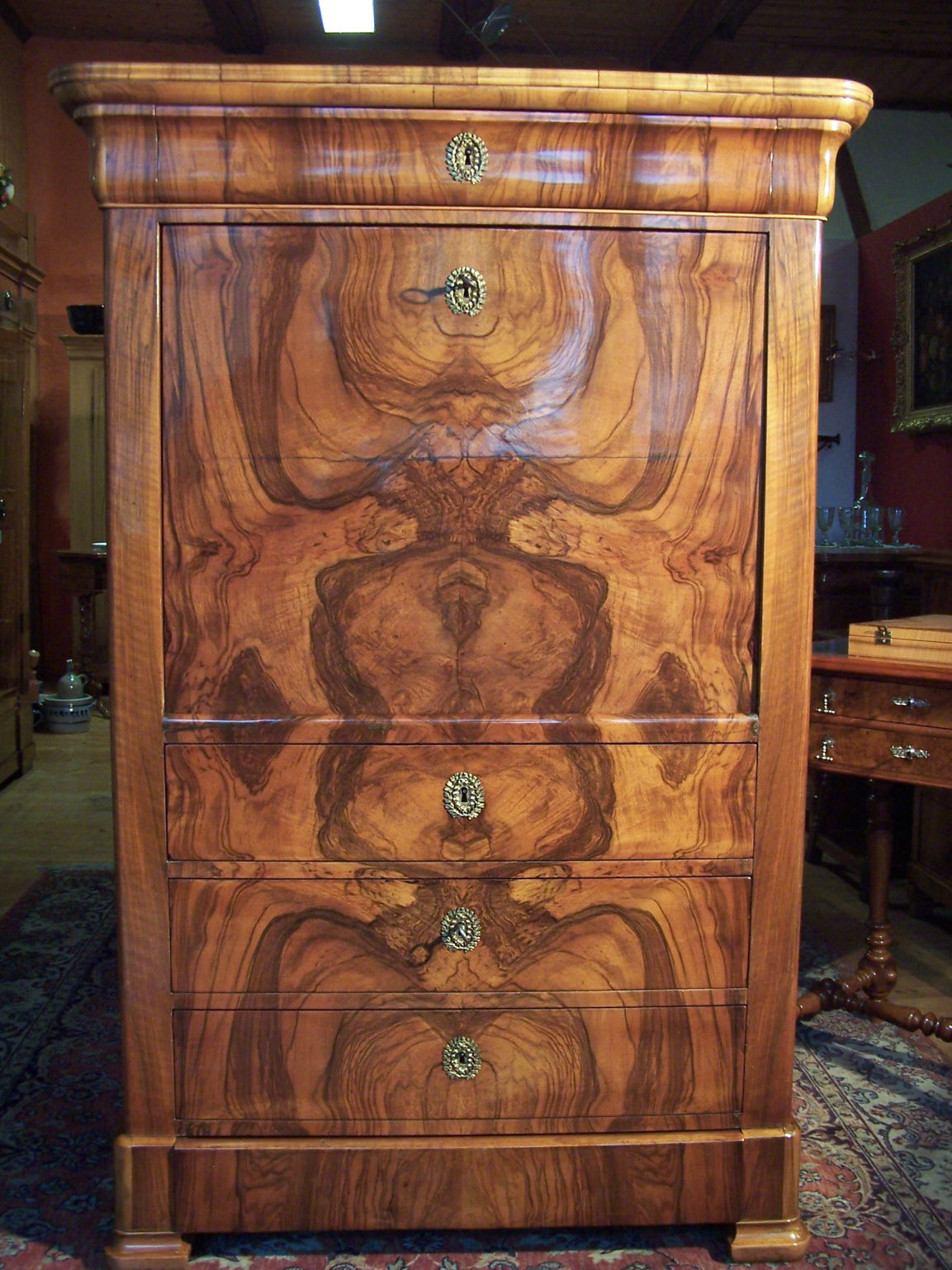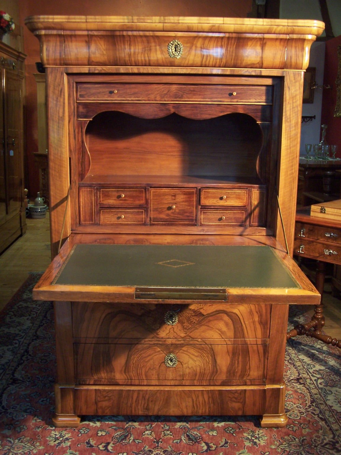 Das Möbel ist mit sehr feinem Nussbaum Furnier belegt. Der Schreiner damals hatte ein sehr gutes Auge für das feine Furnierbild. Der Korpus besitzt fünf Schubladen und eine Klappe die als Schreibunterlage dient. Auf der Klappe befindet sich ein feines Leder. Im Innenbereich befinden sich acht Schubladen, zwei davon sind Geheimfächer mit einem verborgenen Mechanismus zu öffnen. Ein herrliches, elegantes und doch schlichtes Möbel, dass überall seinen Platz findet.