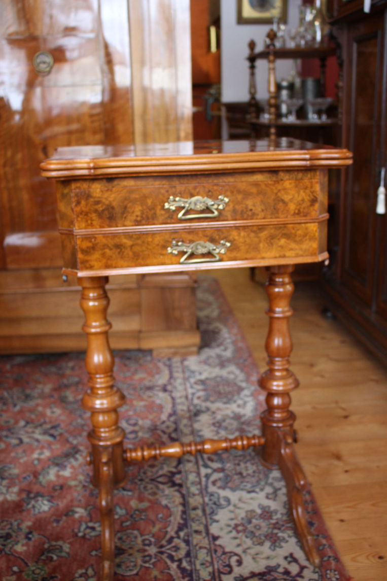 Ein besonders schönes Nähtischchen in außergewöhnlicher Verarbeitung. Das Tischchen hat zwei Schubladen, in der oberen ist die Einteilung für Nähutensilien mit einem Stickkissen. Hier wurde mit feinen Intarsien gearbeitet. Die Platte lässt sich drehen und aufklappen, somit entsteht eine größere Arbeitsfläche oder aber ein Spieltisch. Mit Schellack aufgearbeitet.