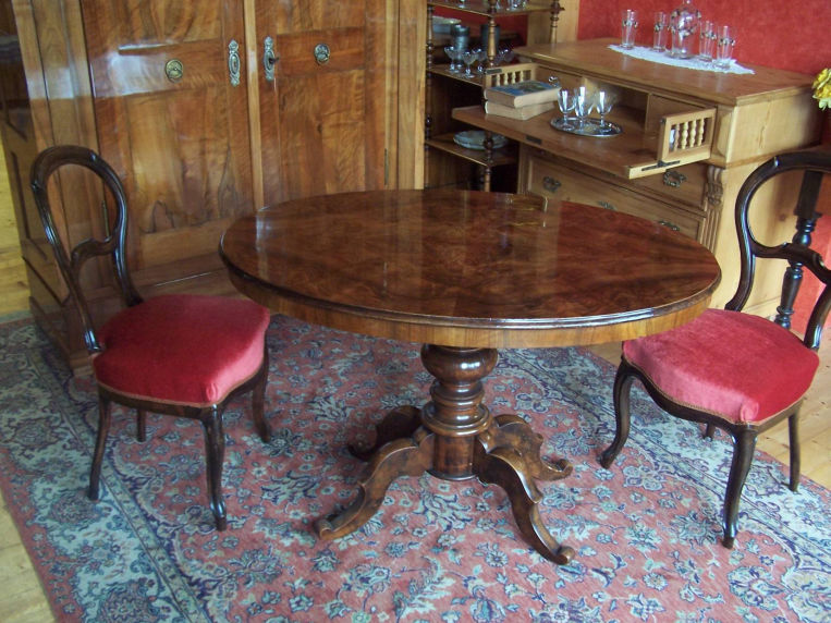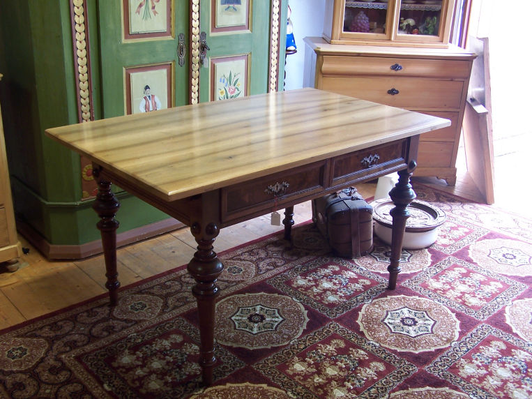 Ein stilechter Tisch der Gründerzeit. Das Gestell ist aus Buche auf Nussbaum gebeizt, die Platte ist massiv Nussbaum. Die beiden Schubladen sind leichtläufig. Der Tisch macht alles mit; Esstisch, Arbeitstisch, Schreibtisch.