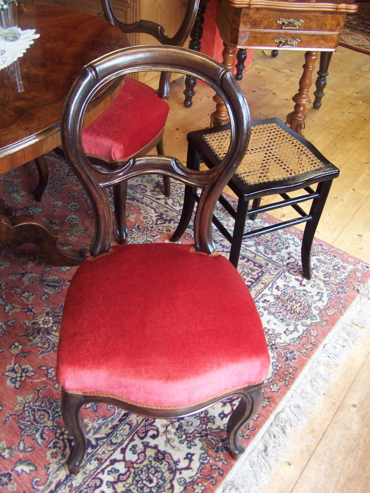 Hier bieten wir 4 Stühle aus der Zeit um 1860 an. Wie zu damaliger Zeit üblich sind die Stühle aus Buchenholz gefertigt und auf Nussbaum gebeizt. Im Laufe ihres Lebens wurden sie neu gepolstert. Hier eine Detailaufnahme