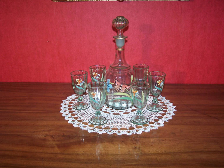 Karaffe um ca. 1850, mundgeblasen mit Abriss und eingeschliffenem Stöpsel. Dazu sechs Weingläser. Die Garnitur hat ihre originale Bemalung sehr gut erhalten