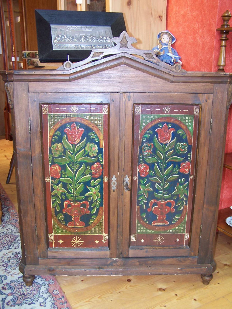 bemaltes Schränkchen um etwa 1870. Die Bemalung ist original erhalten, das Möbel ist aus dem süddeutschen Raum. Im Innern befinden sich 2 Regalbretter.