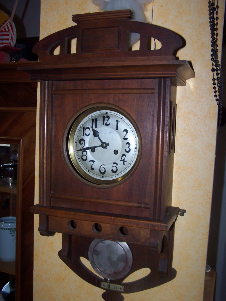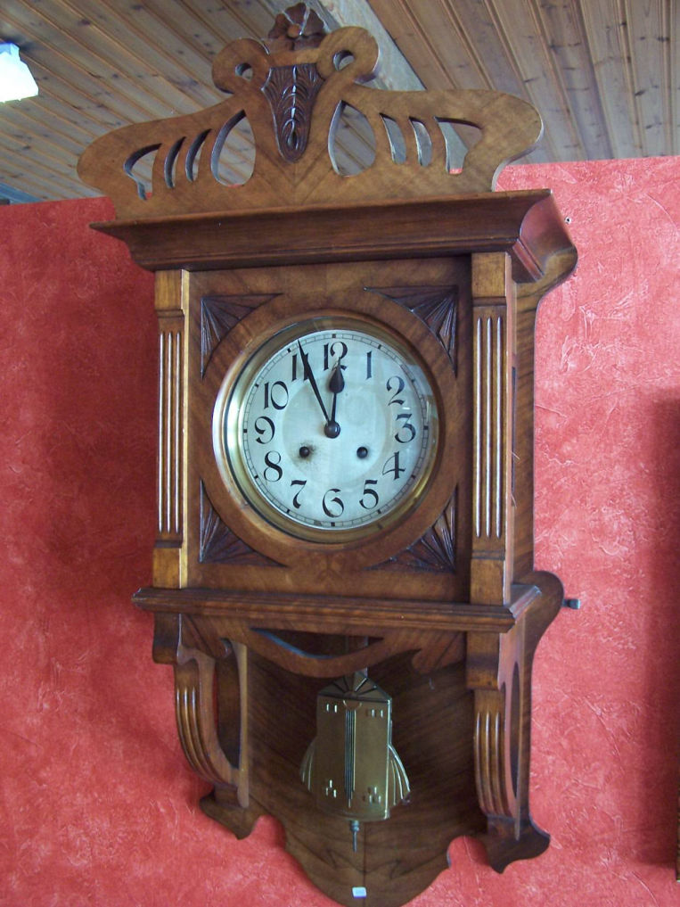 Hier bieten wir einen schlichten Freischwinger um etwa 1910. Das Gehäuse ist teilmassiv und furniert. Das Werk läuft gut, der Schlag ist angenehm