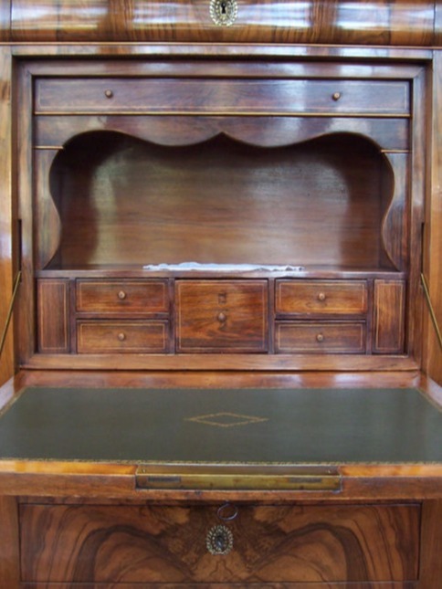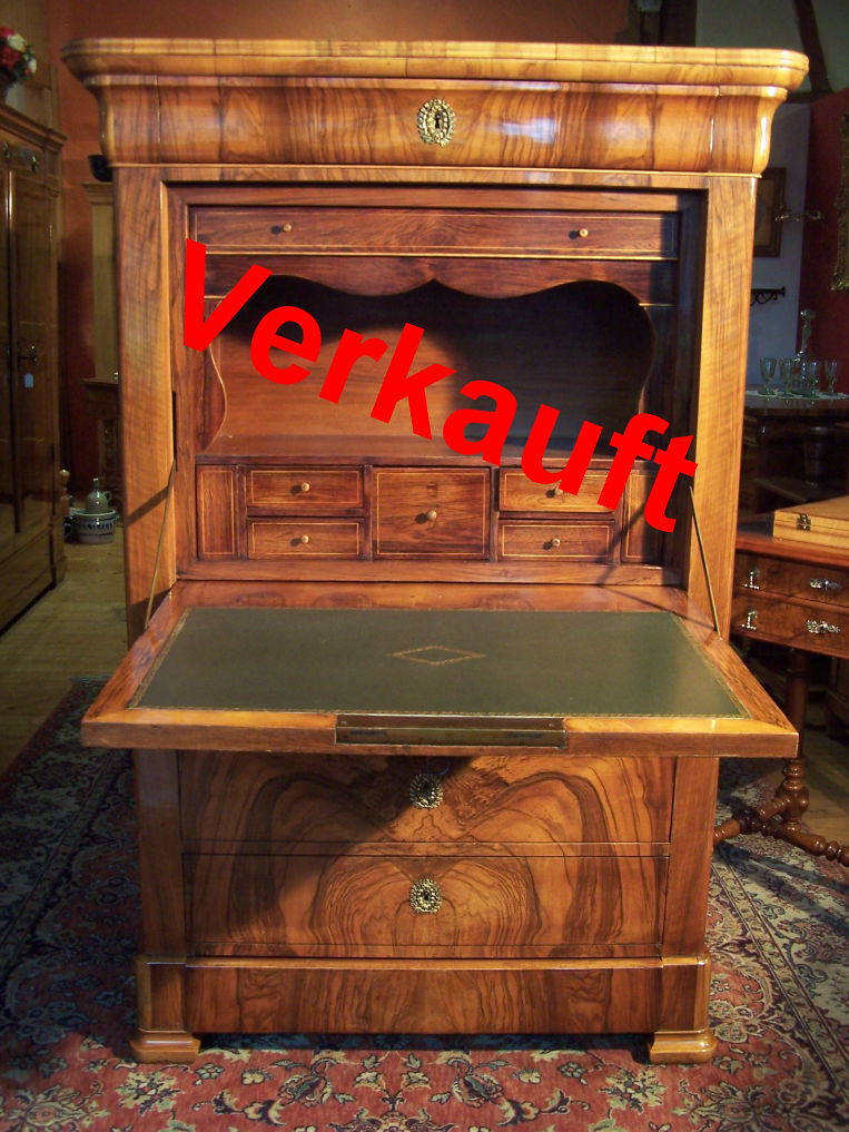Das Möbel ist mit sehr feinem Nussbaum Furnier belegt. Der Schreiner damals hatte ein sehr gutes Auge für das feine Furnierbild. Der Korpus besitzt fünf Schubladen und eine Klappe die als Schreibunterlage dient. Auf der Klappe befindet sich ein feines Leder. Im Innenbereich befinden sich acht Schubladen, zwei davon sind Geheimfächer mit einem verborgenen Mechanismus zu öffnen. Ein herrliches, elegantes und doch schlichtes Möbel, dass überall seinen Platz findet.