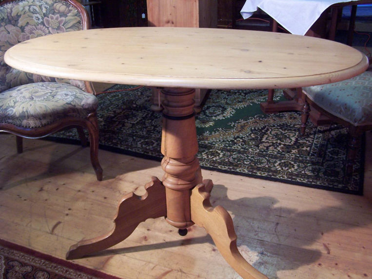 Dieser ovale Tisch ist eine Rarität. Der Fuß ist aus heller Buche, die Platte aus Tannenholz. Er besticht durch seine gefällige Form. Wenn er mal nicht gebraucht wird lässt sich die Platte senkrecht stellen und spart somit Platz. Sehr schöner, restaurierter Zustand.