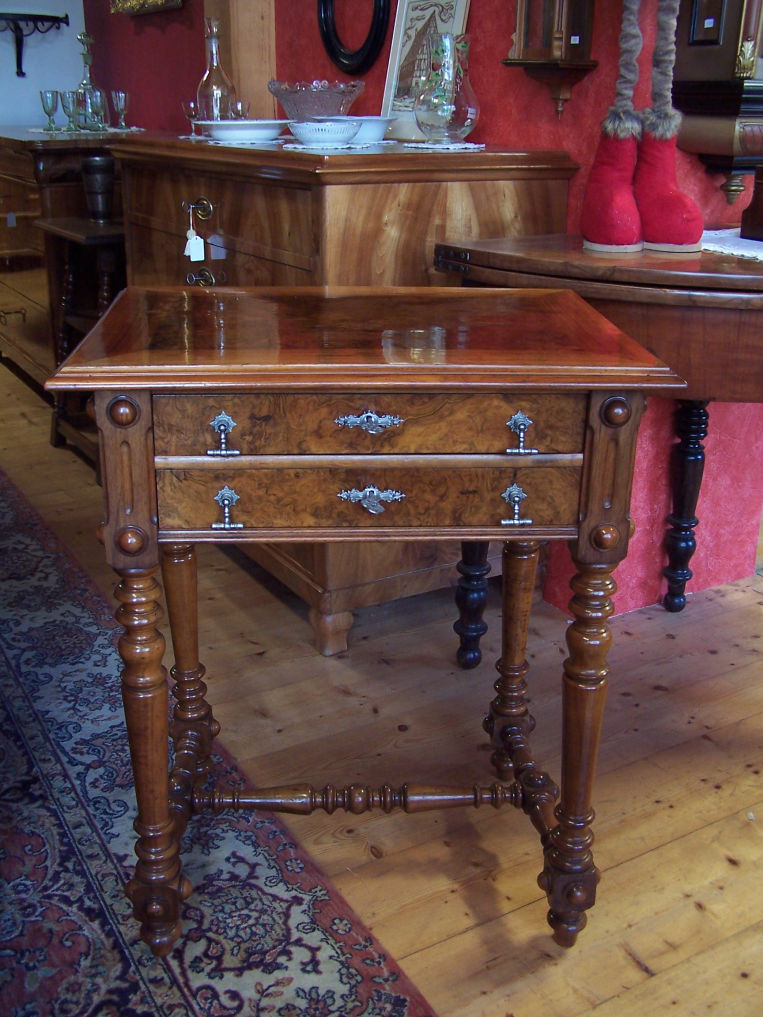 Nähtischchen um 1890 gefertigt. Die Beine und Drechselarbeiten sind aus Buche gefertigt und auf Nussbaum gebeizt. Der Korpus ist aus Fichtenholz und mit schönem Nussbaum Furnier belegt. Alle Teile sind original. Das Möbel wurde mit Schellack überarbeitet. Ein schönes Möbel, dass überall hinpasst.